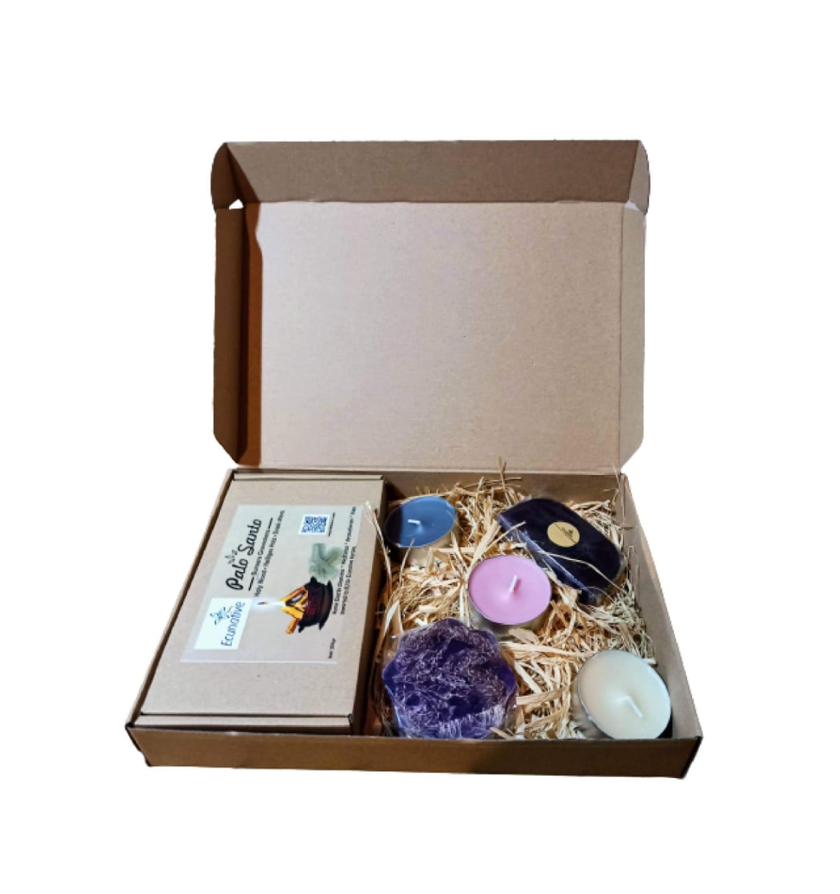 200g Palo Santo box plus Lavender Loofah soap120g plus Lavender & Rosemary solid Shampoo 110g plus 3 candles (Rose/white/blue-purple)